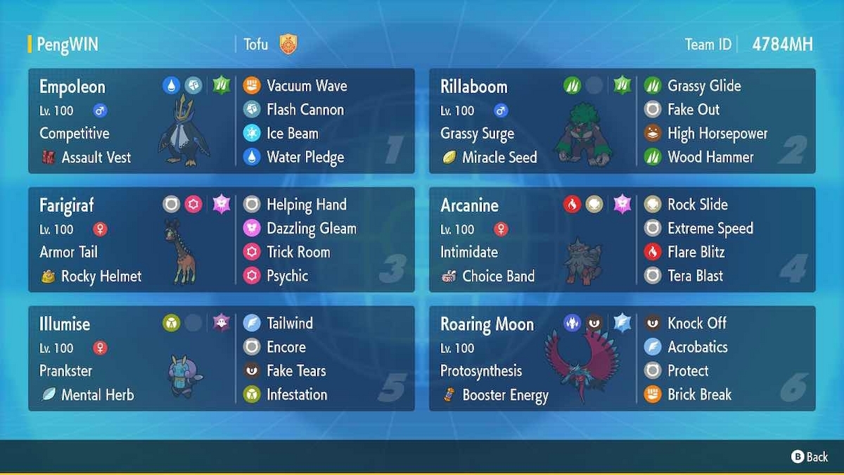 Empoleon/Hisuian-Arcanine/Rillaboom all filled the FWG core defensively, while giving us a myriad of offensive options and utility. Since both of these Pokémon are quite splashable, it felt very easy to slot them into the team. Illumise and Farigiraf were added for their Tailwind/Trick Room combination while giving us both Priority utility unique to Illumise and Armor Tail for Priority denial.